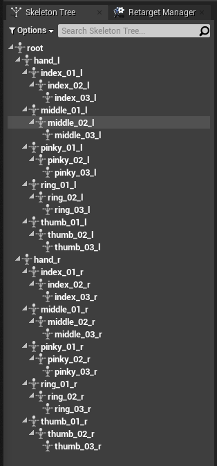 On the right is the general bone structure for the hand reference mesh. Based off the stock UE4 mannequin, all other bones are removed other than hand_l, hand_r and all their child bones.