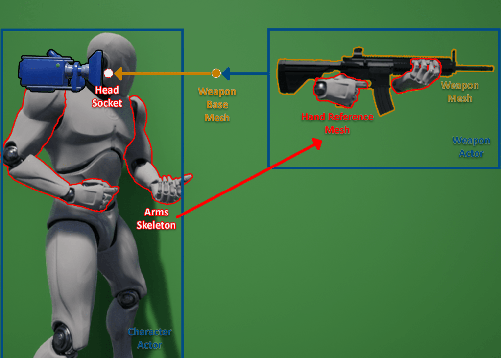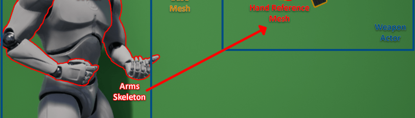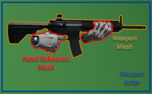 The weapon actor will contain the Weapon Mesh and Hands Reference Mesh. Mesh Component Hierarchy of these 2 should look like diagram on the right. Will also contain functions / events weapon control (i.e. Fire, Aim, etc.).