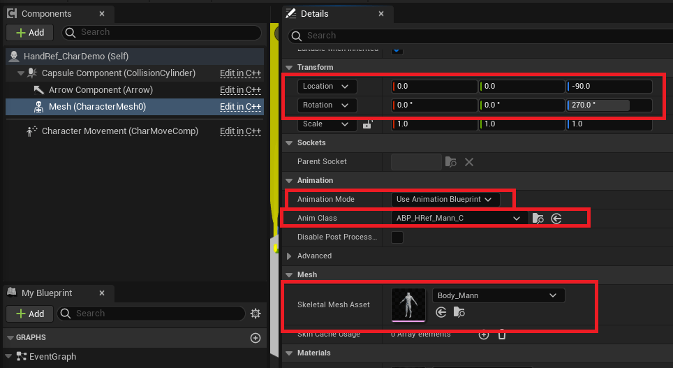 - On the the existing Mesh Component, change Skeletal Mesh Asset to “Body_Mann” (provided in this pack, based on UE4 mannequin), change Animation Mode to “Use Animation Blueprint”, and change Anim Class to “ABP_Href_Mann”. Finally, change the Location Z value to -90 and Rotation Z value to 270.