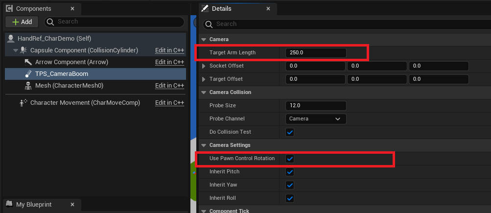 - Add a Spring Arm Component, attach it to the Capsule Component. Change Target Arm Length to 250, set Use Pawn Control Rotation as checked.