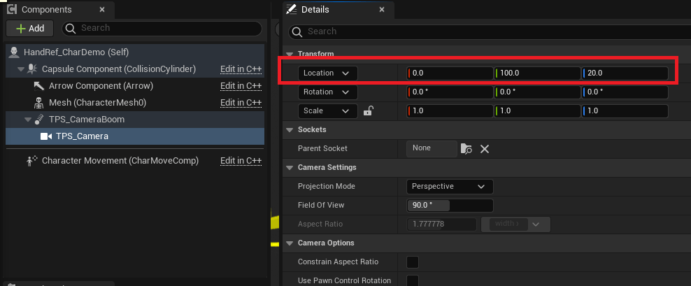 - Add a Camera Component for the TPS camera, attach it to the Spring Arm in the previous step. Change Transform Location to X:0; Y:100; Z:20;