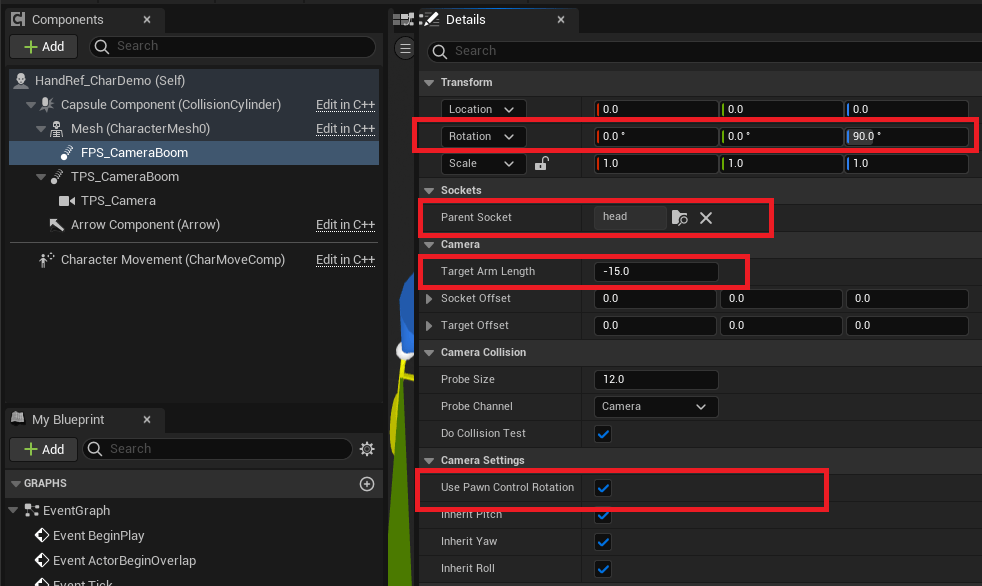 - Add a Spring Arm Component, attach it to the Mesh Component. Change the Parent Socket to “head”, change Target Arm Length to -15, set Use Pawn Control Rotation as checked, and finally, set Transform Rotation Z value to 90.