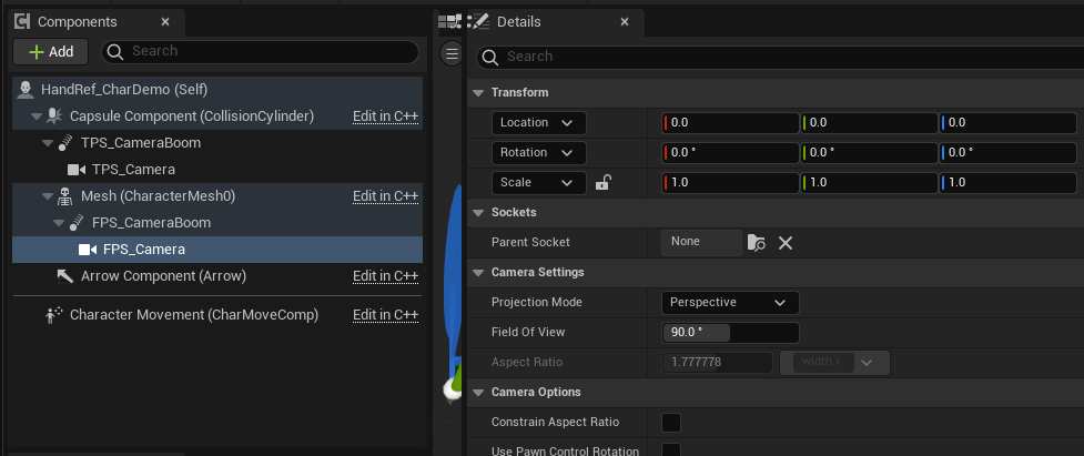 - Add a Camera Component for FPS Camera, attach it to the Spring Arm in the previous step.