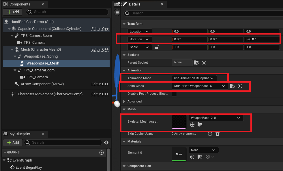 - Add a Skeletal Mesh Component for the weapon base, attach it to the Spring Arm in the previous step. Change Skeletal Mesh Asset to “WeaponBase_2_0”, change Animation Mode to “Use Animation Blueprint”, and change Anim Class to “ABP_Href_WeaponBase”. Finally, change the Transform Rotation Z value to -90.