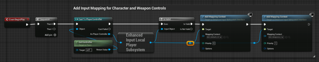 - In your graphs build off the Event BeginPlay to add mappings for IMC_Default_HRAnim and IMC_Weapons_HRAnim as illustrated below: