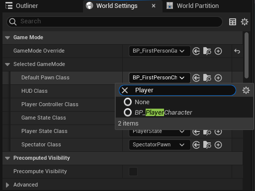 - Go to World Settings, open the Selected GameMode drop down, change Default Pawn Class to “BP_PlayerCharacter”