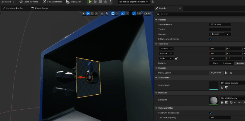- Make sure to set the Parent Socket for the PPExcluder Static Mesh Component to the one we created earlier in the ScopeMesh.