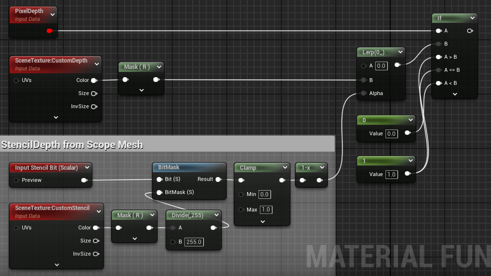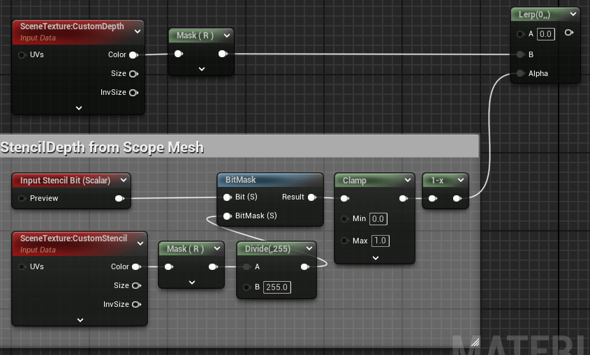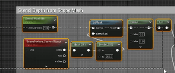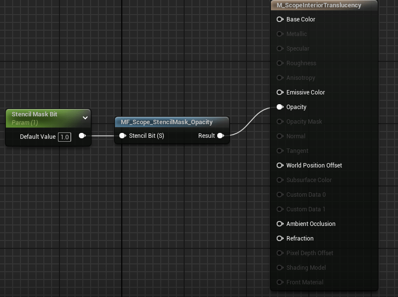 - Create a Scalar Parameter node name it Stencil Mask Bit set the default value to 1. Create a Material Function Node set the Material Function to M_ScopeInterior_TranslucencyMasker. Connect the Scalar Parameter to the Material Function and connect the Material Function to the Opacity pin.