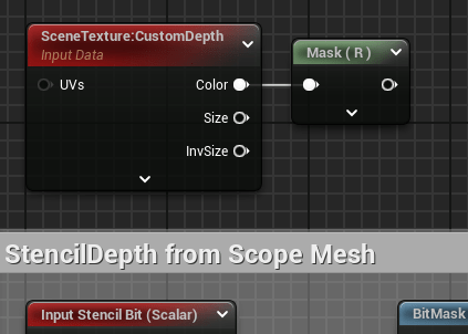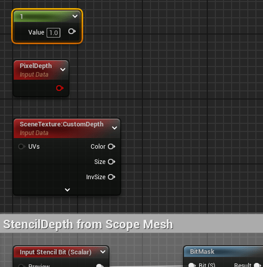 - Open the M_Sight_PostProcess material we copied over under ScopePP_DEMO > Scope. Copy this section. As it will be used to identify the stencil we set earlier for the PP Mask mesh earlier (should be value of 1)