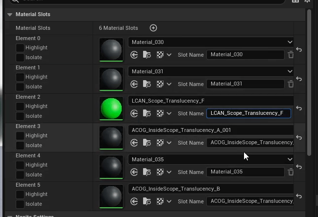 - Replace the designated slots with the scope interior translucent material we created